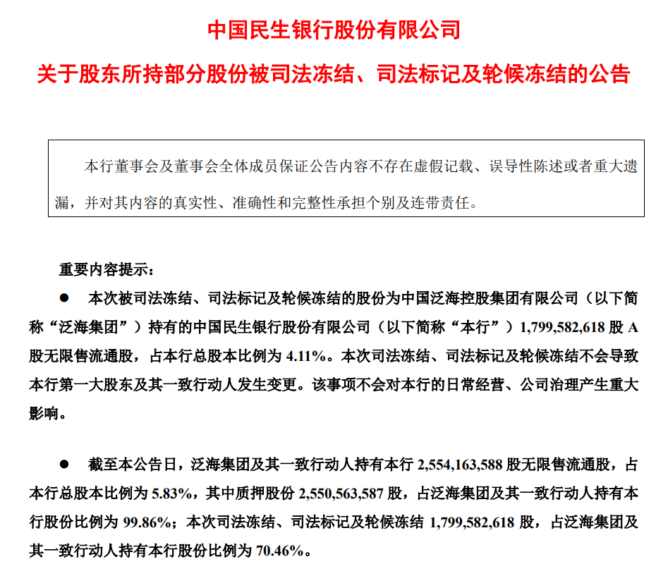 3月17日晚间,民生银行发布公告称,该行股东中国泛海控股集团有限公司持有的近18亿股A股无限售流通股被司法冻结、司法标记及轮候冻结,占该行总股本的4.11%,占泛海集团及其一致行动人持有该行股份比例的70.46%。