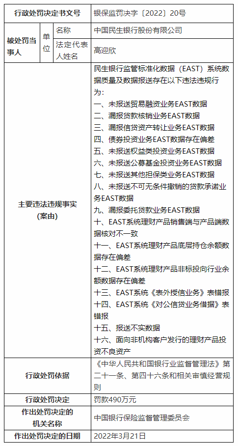 行政处罚信息公开表显示,民生银行监管标准化数据(EAST)系统数据质量及数据报送存在“未报送贸易融资业务EAST数据”、“漏报贷款核销业务EAST数据”、“债券投资业务EAST数据存在偏差”等16项违法违规行为。依据《中华人民共和国银行业监督管理法》第二十一条、第四十六条和相关审慎经营规则,罚款490万元。