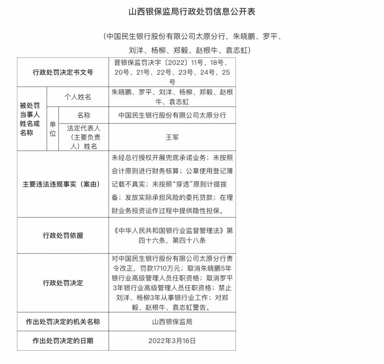 银保监会官网信息显示,3月19日,民生银行太原分行因未经总行授权开展兜底承诺业务、未按照会计原则进行财务核算、公章使用登记簿记载不真实等六项违法违规事实,被山西银保监局罚款1710万元。7名相关负责人同时被罚。
