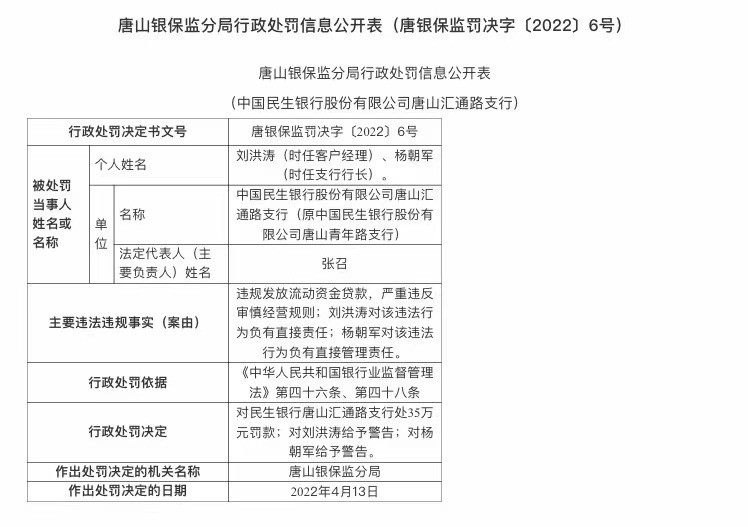 4月25日,银保监会官网消息显示,民生银行唐山汇通路支行因违规发放资金贷款,严重违反审慎经营原则被罚款35万元,时任客户经理的刘洪涛、时任支行行长的杨朝军被予以警告。