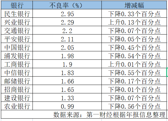 其中,农业银行不良率最低,截至去年末,不良率为0.99%,较上一年年末下降0.56个百分点,降幅最大;民生银行不良率最高,为2.95%,但较上一年年末已下降0.33个百分点,且不良资产余额也有下降。
