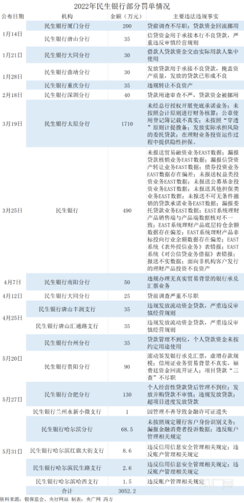 5月末尾,在民生银行合肥分行被罚后,时隔仅数日,民生银行哈尔滨分行也领了罚单,被罚近70万元。据央广网记者不完全统计,今年前5个月,民生银行旗下分支机构已合计被罚超过3000万元。