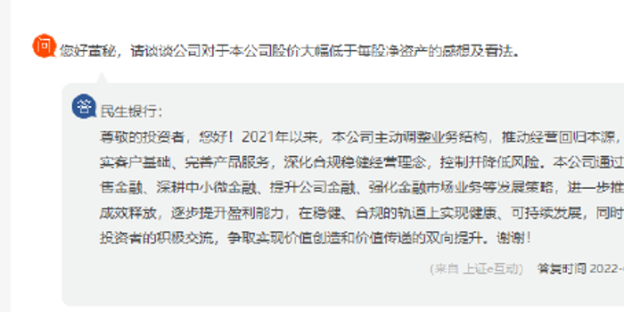 6月10日消息,今日民生银行召开2021年股东大会,同日董秘在上证e互动在线回复了股民的提问,对于股价大幅低于每股净资产、营收下降的质问做出回应。