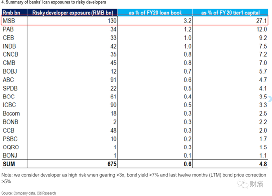 在此之前,花旗的一份研报,揭开了民生银行对地产商的账本。花旗估计,民生银行对高风险开发商的风险敞口约为1300亿元人民币,占一级资本的27%,为国内大型银行中占比最高的。