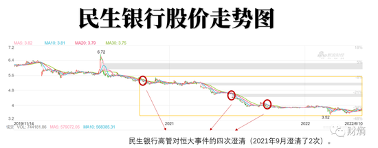 恒大事件爆发以来,民生银行的股价持续走低,从2020年9月的稳居5元上方,最低跌至今年3月的3.4元,市值蒸发超30%。