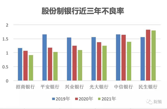 另外,民生银行的不良率高居不下,2020-2021年连续两年为所有股份制银行中最高的。