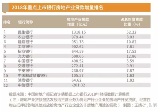 民生银行对地产行业的业务倾斜之后,带来了肉眼可见的变化。2018-2019年,民生银行的对公贷款规模出现明显增长。其背后,房地产贷款业务贡献最大——连续两年,房地产贷款成为占民生银行贷款总额最高的第一大行业业务。2018年,民生银行对房地产行业的贷款增量,在有所重点上市银行中排名第一。