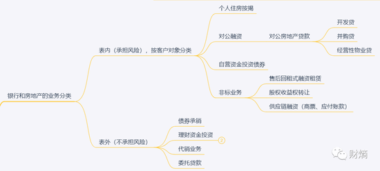 一般来说,银行和地产的业务可以分为两大类:除了个人住房按揭,其余的基本为对公,即和房企的合作业务。对公业务又可以按表内和表外的标准划分,表内业务包括开发贷、并购贷等对公房地产贷款、投资债券和非标业务;而表外业务则包括代销业务、委托贷款、理财资金投资等。