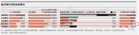 民生银行其余对房企的融资,包括债券投资、标准债权投资、非标债权投资等,其披露的这一数据为1026亿元,占比28.48%。其中,涉房的理财资金投资业务规模达403亿,体量仅次于房地产贷款;第三大业务是债券承销,金额为301亿。