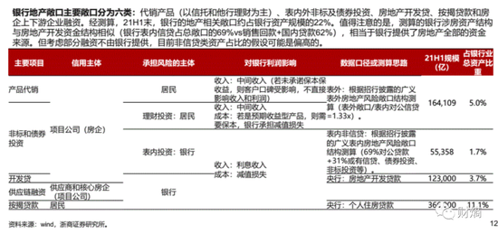 根据浙商证券研究所2021年10月的一份研报,银行对地产的主要敞口分为六类:房地产开发贷、按揭贷款、表内外非标及债券投资、代销产品(以信托和他行理财为主)、房企上下游企业融资。其中,除了产品代销,以及部分非标和债券投资,其余项目的承担风险主体均为银行。