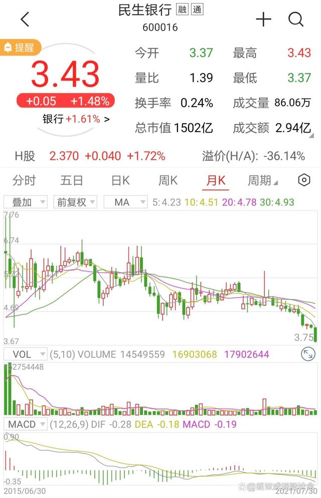 民生银行这股票走势真吓人,从2015年大牛市创下高点7.71元到现在,7年时间一路阴跌不止,市值缩水约1900亿,股价目前3.43元,已经回到2013年1月,十年不涨!
