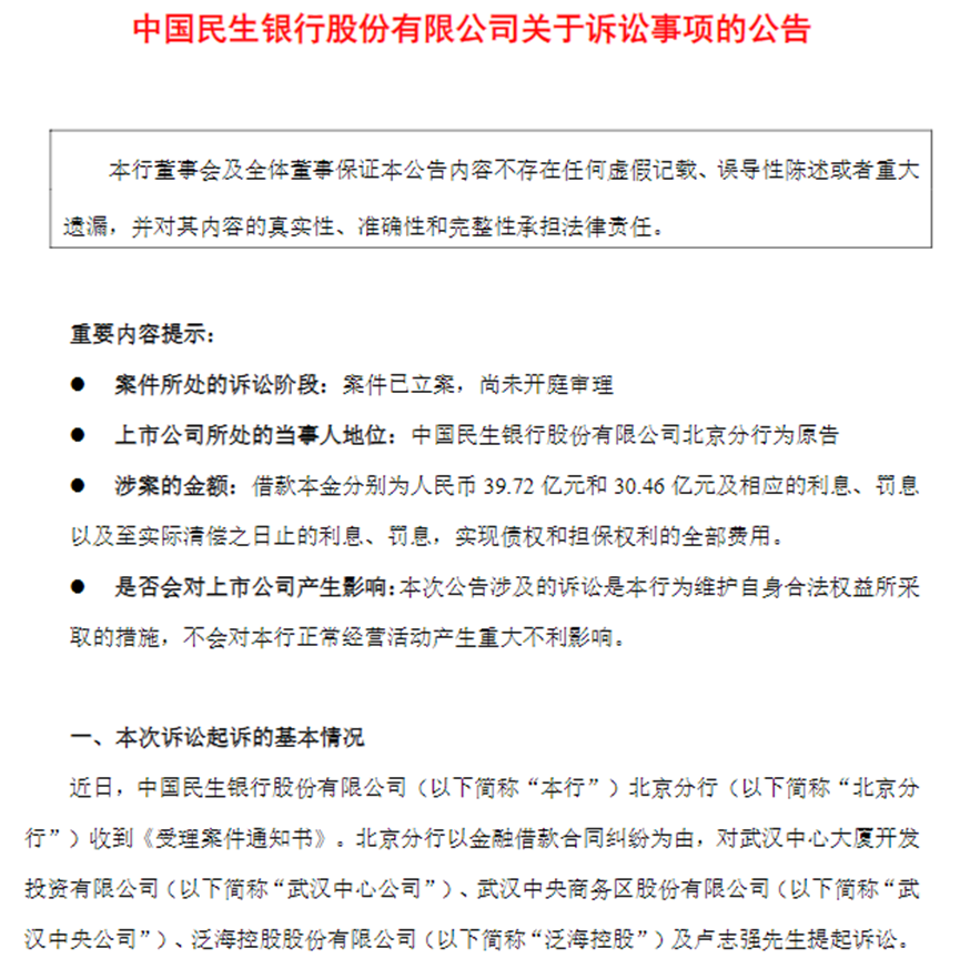 聚焦风险管控,已起诉泛海控股