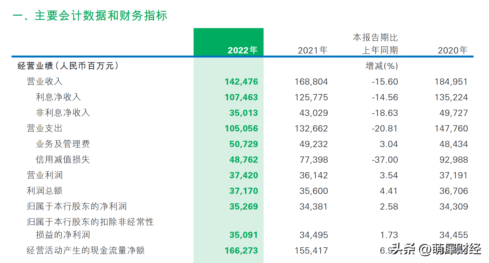 经营业绩方面,报告期内,民生银行实现营业收入1424.76亿元,同比下降15.60%,数据显示,这已是民生银行营业收入连续第二年同比下降。另外,民生银行2022年实现归属于本行股东的净利润352.69亿元,同比增长2.58%。