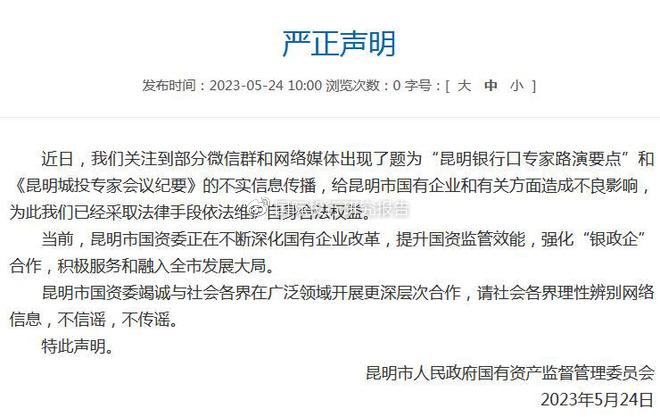 5月24日上午,昆明市国资委发布严正声明,称近日关注到部分微信群和网络媒体出现了题为“昆明银行口专家路演要点”和《昆明城投专家会议纪要》的不实信息传播,给昆明市国有企业和有关方面造成不良影响,为此已经采取法律手段依法维护自身合法权益。