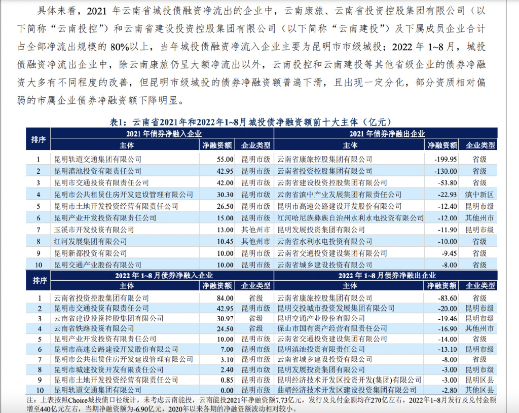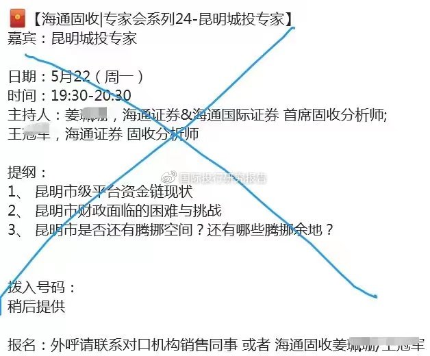 然后,海通证券为其客户组织了专家会议,后来网上流传出“昆明银行口专家路演要点”和《昆明城投专家会议纪要》的文件。在这份文件中,要点是昆明部分城投企业(地方融资平台)到期公募债偿还困难较大,地方政府正多方筹措资金,包括向某东部大市城投借钱,但仍面临较大压力。而让昆明国资委陷入尴尬的是其中一位后来确认是来自民生银行的专家发表了一些不可接受的猜测性资金来源的观点。