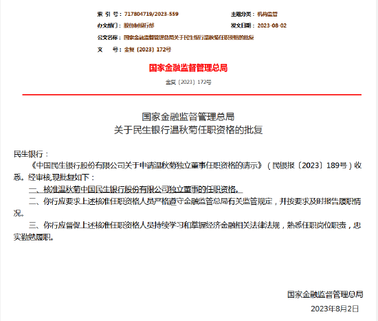 8月7日金融一线消息,国家金融监督管理总局网站发布批复文件显示,核准温秋菊中国民生银行股份有限公司独立董事的任职资格。