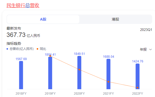 光从营收规模来看,民生银行这两年是王小二过年,一年不如一年。2020年的时候营收还有1800多亿,2年掉了400亿,现在只剩1400多亿了。