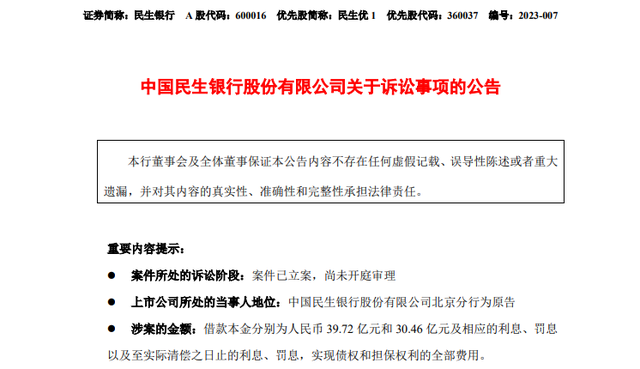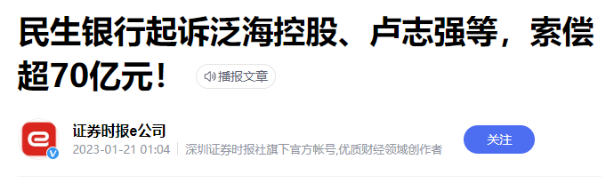 到了今年民生银行终于是坐不住了,向泛海控股和卢志强发起诉讼,要求其归还两笔借款本金39.72亿元和30.46亿元及相应的利息、罚息。