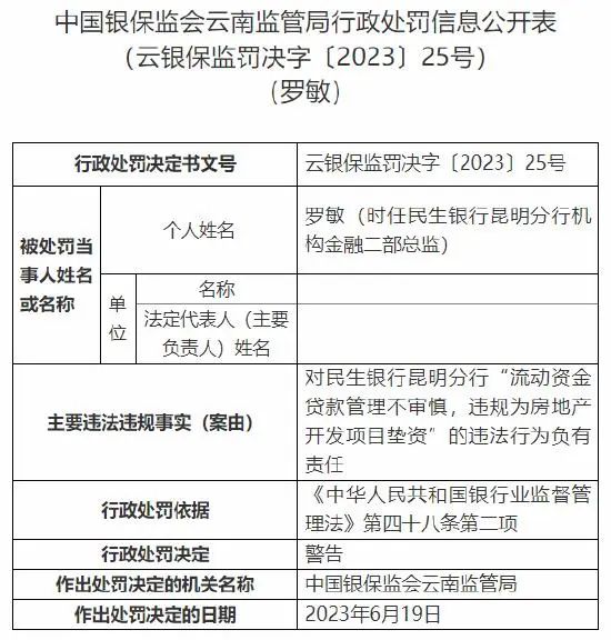 另一张375万元的罚单则来自民生银行昆明分行,具体违规事实有小微企业个人贷款管理不审慎;违规为房地产开发项目垫资等11项。