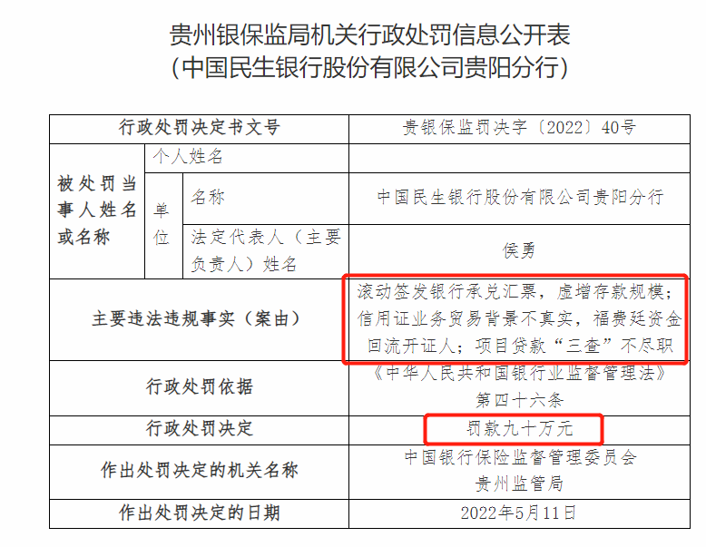 其后不久的5月20日,民生再度“犯事”,贵州银保监局一连向民生银行下发4份行政处罚公告,并以“虚增存款规模”和“项目贷款三查不尽职”等为违规依据,对民生银行贵阳分行予以90万元的行政处罚。