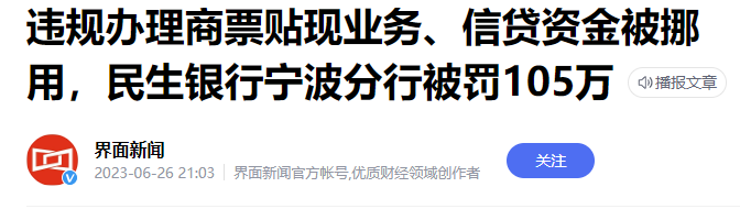 6月26日,民生银行宁波分行又被官方通报,因信贷资金被挪用、违规办理商票贴现业务等违规事实,又收到105万元罚单。