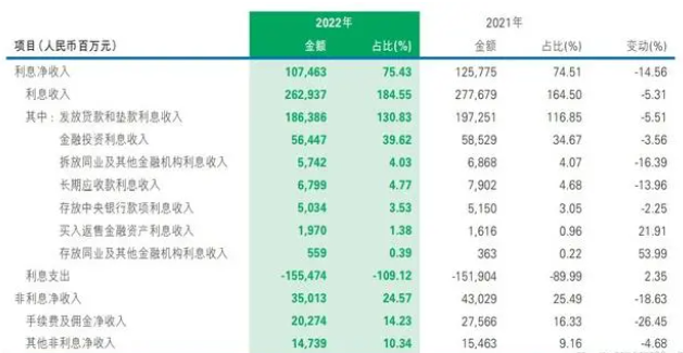 2022年,民生银行实现发放贷款和垫款利息收入1863.86亿元,同比减少5.51%,利息收入同比减少173.62亿元,抵消了日均规模增长的贡献。