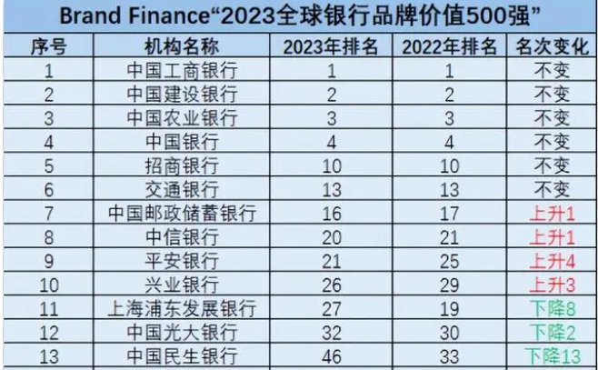 到了2023年,根据《2023年全球银行品牌价值500强》榜单显示,民生银行排名下滑至46名,品牌价值也从98.34亿美元降至75.23亿美元,缩水23.11亿美元。