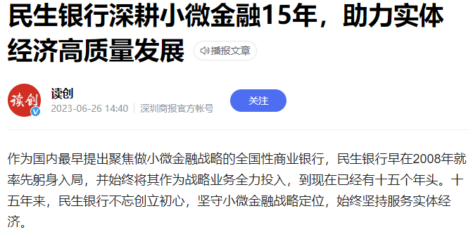 由于民生银行是由民间资本组建,且有着为民营企业服务的初衷,相比于国有行没有雄厚的背景的支持,所以“民营”的色彩特别浓厚。