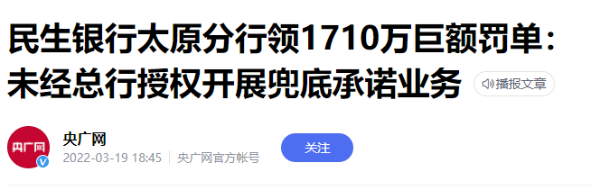 比如,2022年3月19日民生银行曾因违规经营被山西银保监局予以1710万元行政处罚,并责令整改。