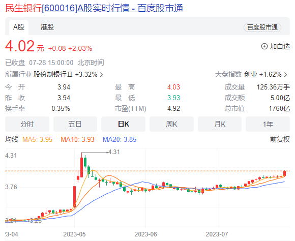 虽然前段时间,借着“中特估”的行情、银行板块的集体上攻,民生银行的股价个把月的时间涨了20多个点。