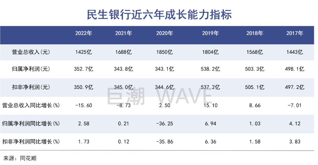 频繁踩雷与增长乏力的后果,最终会体现到经营业绩中。2020年民生银行的净利润首次出现下滑,跌幅约36%。更诡异的是2022年,营业收入同比下滑15.6%,净利润竟然略有增长。