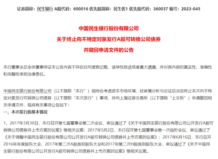 8月12日,民生银行发布公告,决定终止本次向不特定对象发行不超过500亿元的可转换公司债券事项。