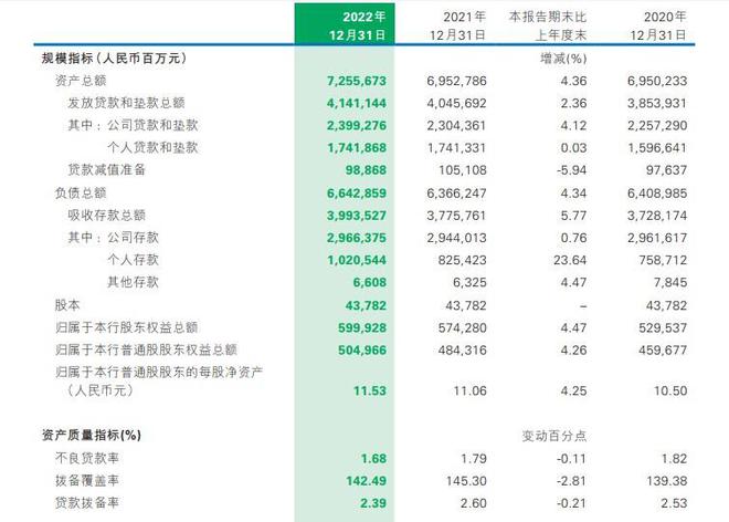 不良贷款率1.60%,比2022年末下降0.08个百分点;