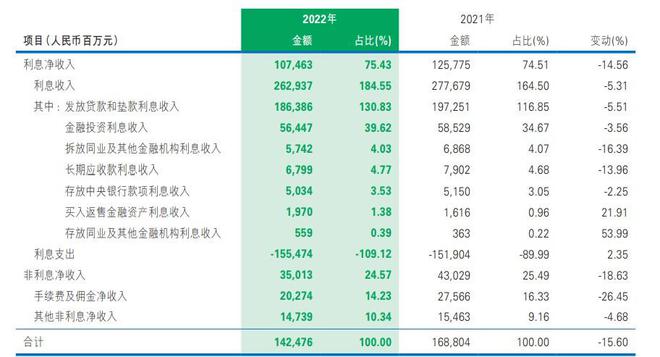 根据该行2022年报披露,2022年,民生银行整个集团(下同)营业收入1424.76亿元,相较于2021年的1688.04亿元,下滑了15.6%左右。