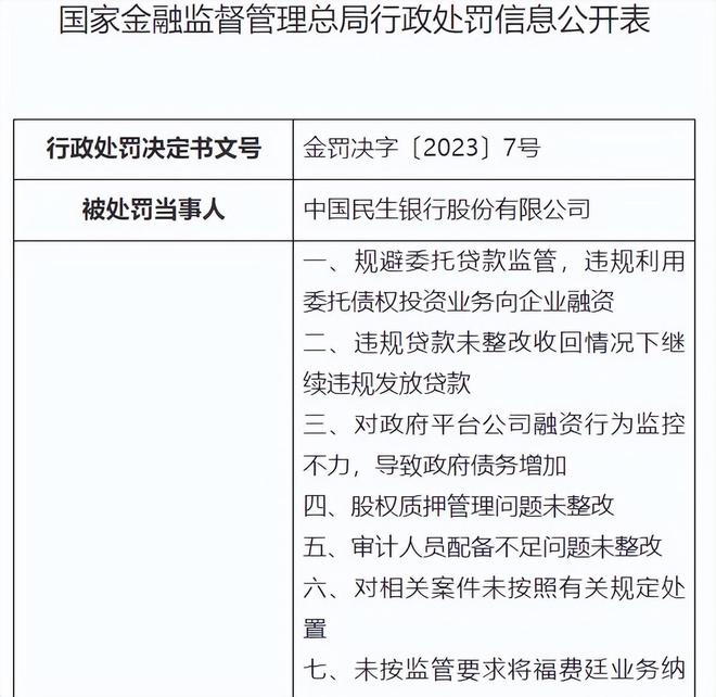 国家金融监督管理总局行政处罚信息公开显示,民生银行因为: