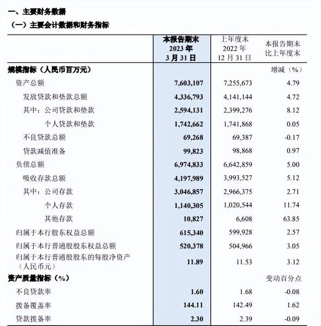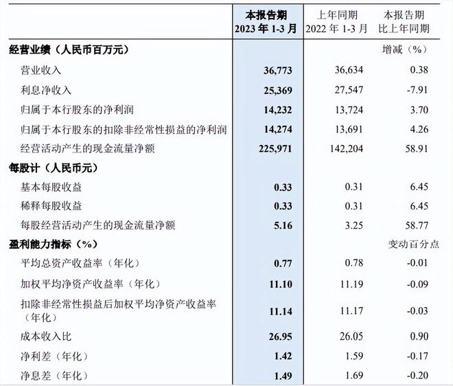 该行称,积极推进经营质效提升,2023年一季度生息资产日均余额68,909.56亿元,同比增长4.49%;各项贷款日均余额42,074.64亿元,同比增长3.24%;各项存款日均余额41,152.99亿元,同比增长8.26%。