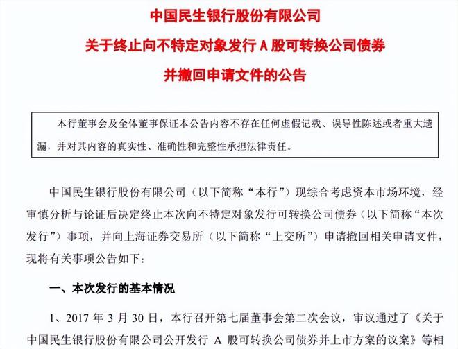 1)事情要回到2017年3月30日,民生银行召开第七届董事会第二次会议,审议通过了《关于中国民生银行股份有限公司公开发行A股可转换公司债券并上市方案的议案》等相关议案;此后继续通过相关议案。