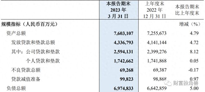 截至2023年3月末,民生银行资产总额76,031.07亿元,同比增幅4.79%,其中,发放贷款和垫款总额43,367.93亿元,同比增幅4.72%;负债总额69,748.33亿元,同比增幅5%;吸收存款总额41,979.89亿元,同比增幅5.12%,其中,个人存款11,403.05亿元,同比增幅11.74%,在吸收存款总额中占比27.16%,比上年末提升1.61个百分点。