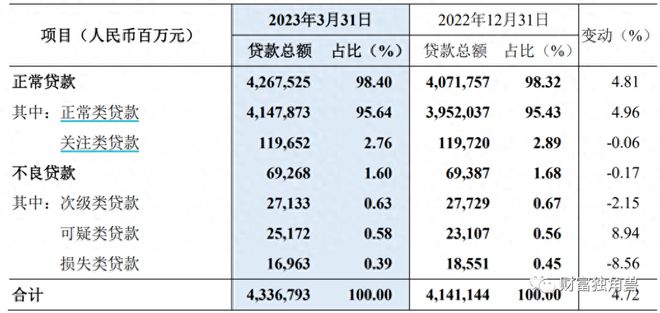 截至2023年3月末,民生银行不良贷款总额、不良贷款率继续比上年末“双降”,拨备覆盖率有所提升,不良贷款总额692.68亿元,比上年末减少1.19亿元;不良贷款率1.60%,比上年末下降0.08个百分点;拨备覆盖率144.11%,比上年末上升1.62个百分点;贷款拨备率2.30%,比上年末下降0.09个百分点。