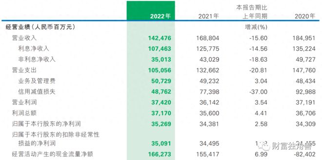 根据2022年财报显示,当年民生银行实现营业收入1424.76亿元,同比下降15.60%;归属于本行股东的净利润352.69亿元,同比增长2.58%,源于降低拨备覆盖率。值得一提的是,这已是民生银行营业收入连续第二年同比下降,虽然在拨备覆盖率降低的基础上实现了利润的增长,但相应风险抵抗能力有所下滑。