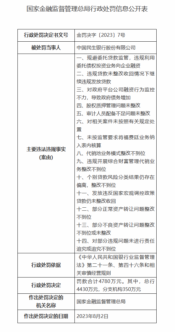 8月18日,国家金融监督管理总局披露的行政处罚信息公开表显示,民生银行被罚款合计4780万元。其中,总行4430万元,分支机构350万元。