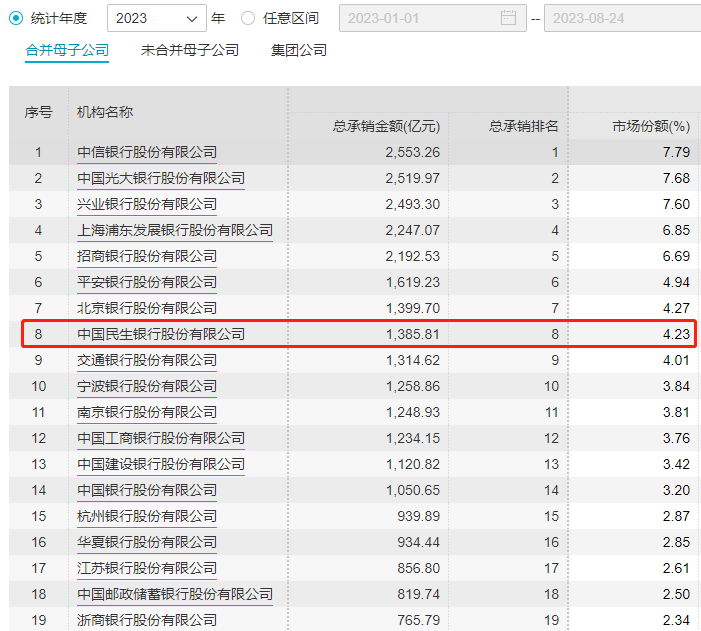Wind数据显示,2023年以来民生银行债券总承销金额达到1385.81亿元,在商业银行中排名第8位,市场份额为4.23%。