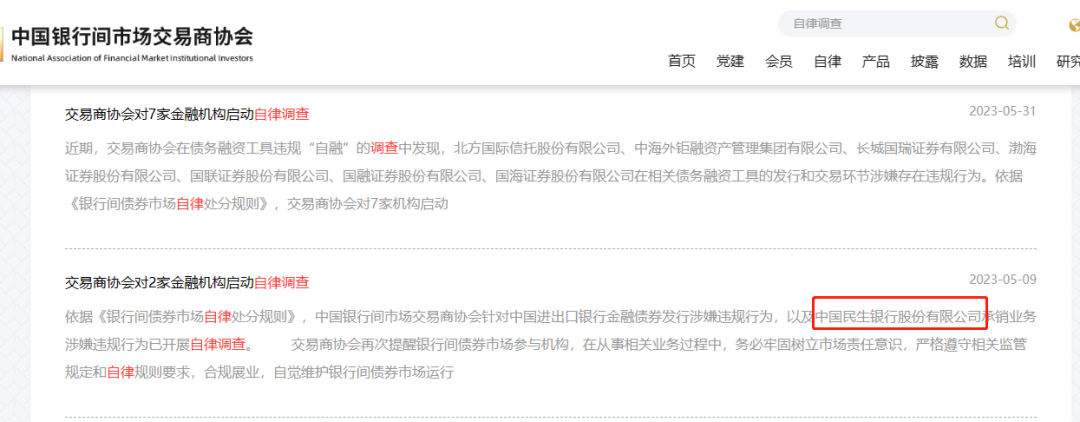 今年5月,交易商协会曾发布公告称,针对民生银行承销业务涉嫌违规行为开展自律调查。