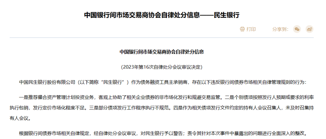 刚被国家金融监管总局开出大罚单,民生银行又被交易商协会点名警告。
