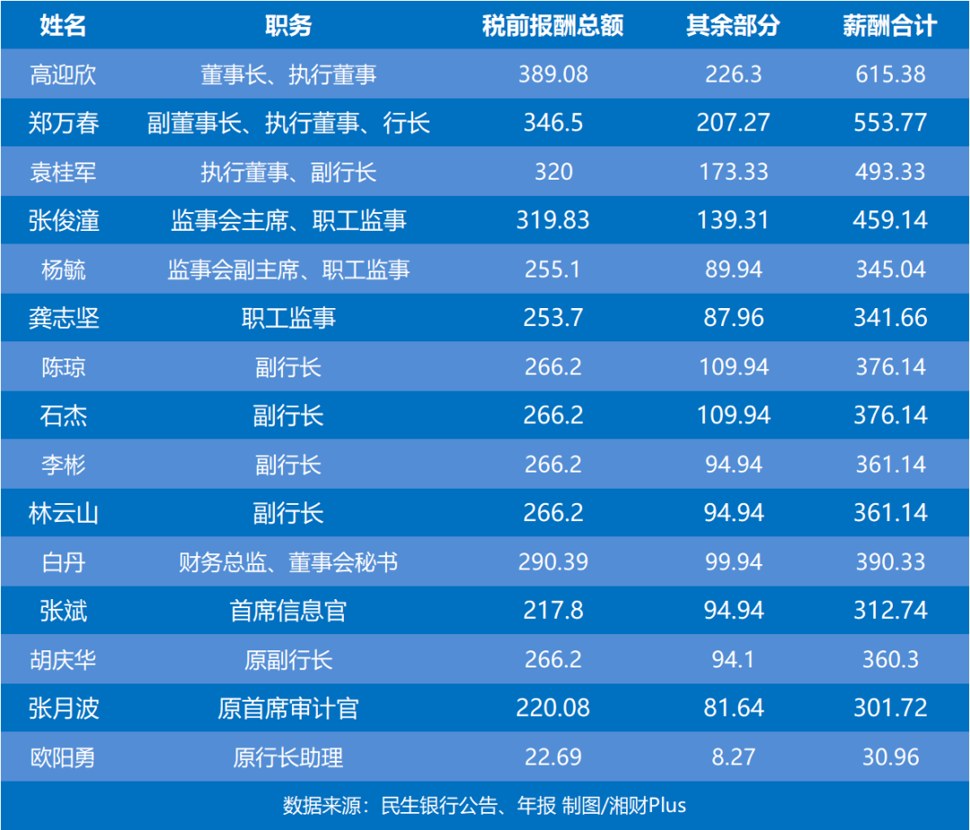 以两次披露的数据合并计算,民生银12位在任高管人均年薪为415.50万元,其中高迎欣以615.38万元位居首位,其次是郑万春553.77万元、袁桂军493.33万元、张俊潼459.14万元、财务总监兼董事会秘书白丹390.33万元,最低的是首席信息官张斌,年薪为312.74万元。