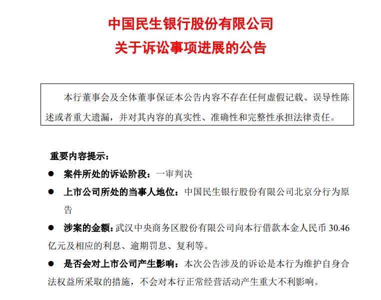 民生银行10月10日发布公告称,北京金融法院一审判决武汉中央商务区股份有限公司(以下简称“武汉中央公司”)于判决生效之日起十日内向民生银行北京分行偿还贷款本金30.46亿元以及相应的利息、逾期罚息、复利;泛海控股和卢志强承担连带保证责任。