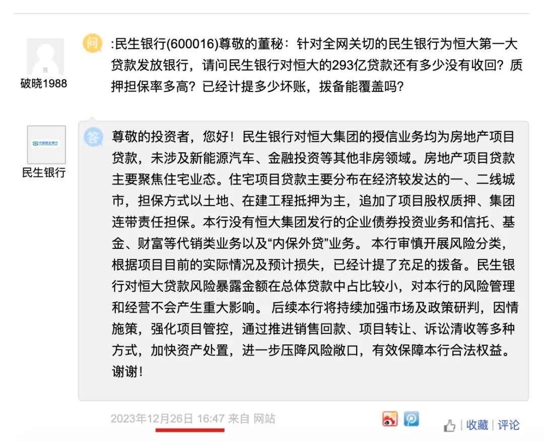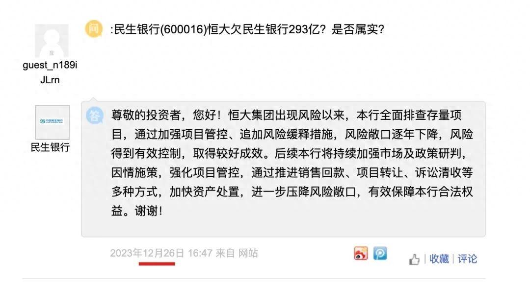民生银行董秘回复:恒大集团出现风险以来,本行全面排查存量项目,通过加强项目管控、追加风险缓释措施,风险敞口逐年下降,风险得到有效控制,取得较好成效。后续本行将持续加强市场及政策研判,因情施策,强化项目管控,通过推进销售回款、项目转让、诉讼清收等多种方式,加快资产处置,进一步压降风险敞口,有效保障本行合法权益。