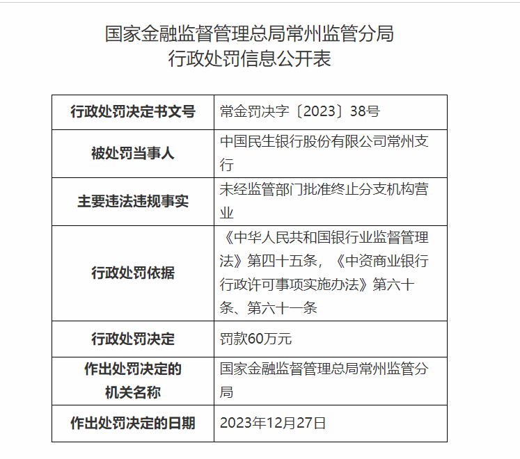 根据今年1月5日的监管信息,中国民生银行股份有限公司常州支行主要违法违规事实未经监管部门批准终止分支机构营业,被罚款60万元。陈希(中国民生银行股份有限公司常州支行零售金融部总经理)还被警告。巧合的是,今年1月4日,中国民生银行股份有限公司盐城分行因违规也被点名通报。国家金融监督管理总局盐城监管分局行政处罚信息公开表显示,中国民生银行股份有限公司盐城分行被罚款110万元。