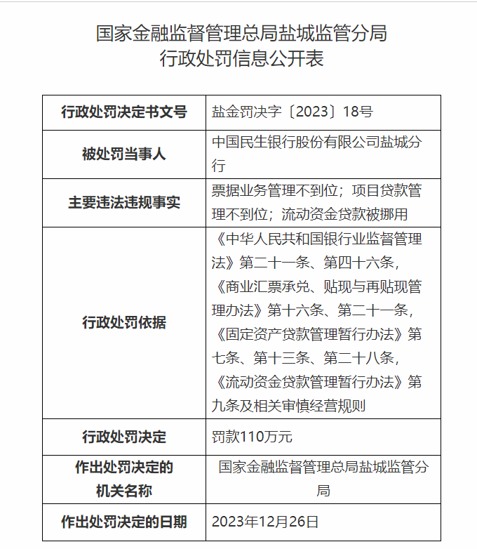 主要违法违规事实:票据业务管理不到位;项目贷款管理不到位;流动资金贷款被挪用。2023年,民生银行还有违规处罚情况。去年7月26日,据国家金融监督管理总局江苏监管局官网公示的行政处罚信息公开表得知,中国民生银行股份有限公司宿迁分行近期因“浮利分费”等三项违规行为被罚110万元,另有三名责任人也遭到警告及罚款。让人诧异的是,民生银行宿迁分行早在2022年就被监管处罚过,属于“惯犯”,据中国银行保险监督管理委员会官网2022年6月6日公布的《宿迁银保监分局行政处罚信息公开表(宿银保监罚决字〔2022〕18号)》显示,中国民生银行股份有限公司宿迁分行办理无真实贸易背景的银行承兑汇票、以票据贴现资金作保证金虚增存款两项违规,依据《中华人民共和国银行业监督管理法》第四十六条第(五)项、《中华人民共和国商业银行法》第七十四条第(三)项,中国银行保险监督管理委员会宿迁监管分局对其罚款人民币155万元。