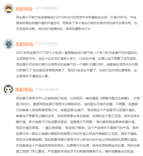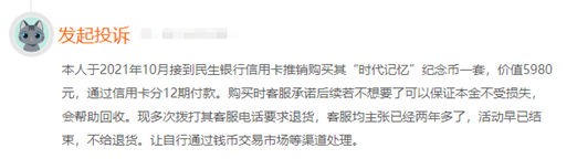来自广东的张先生(化名)在黑猫投诉平台投诉称,2021年民生银行打了好几个电话,一直推销说他们银行有一个专门针对老客户的中国梦纪念品《筑梦中华》,并表示这个纪念币价值XX,以后会升值,如果以后不想要了还可回收。销售人员还称,现在是针对在他们银行办信用卡的老客户的一个福利,只要3980元,直接在信用卡办分期付款就行。